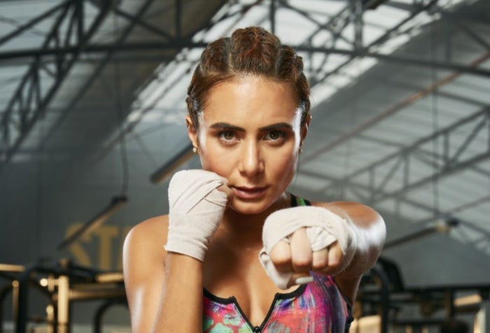 A la actriz se le ve con un arreglo de flores rojas y blancas en su cabeza, una serie de brillantes alrededor de sus ojos y pómulos y su boca con las características líneas negras de las calaveras, haciendo alusión a los dientes.