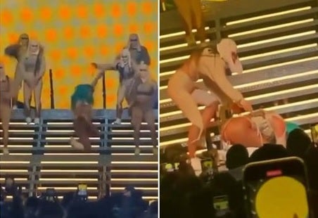 La cantante vestía un body brillante y unas botas largas blancas, cuando un mal paso la hizo resbalar. Cayó más de 10 escalones en pleno escenario.