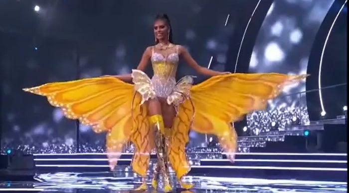 Miss Colombia, Valeria Ayos, brilló con un espectacular traje amarillo, con visos dorados y plateados que evocaban una mariposa. De sus caderas se extendían dos “alas” que elevó con sus brazos, mientras que otras dos caían de sus glúteos.