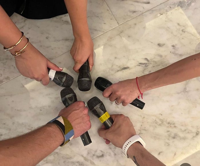 En la imagen se puede apreciar los micrófonos en las manos de cinco de los seis exintegrantes de la agrupación: Anahí, Dulce, María, Maite Perroni y Christian Chávez.