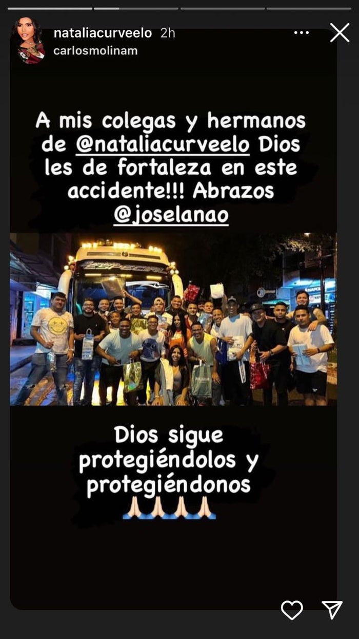 Hace pocas horas, la cantante intérprete del género vallenato Natalia Curvelo, realizó un Instagram Live y publicó varias historias donde relata que su agrupación sufrió un aparatoso accidente cuando se dirigían a la ciudad de Medellín a cumplir sus compromisos.