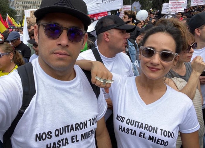 La pareja de actores Santiago Alarcón y Chicila Navia salieron a las calles luciendo camisetas con un mensaje que dice: "Nos quitaron todo, hasta el miedo".