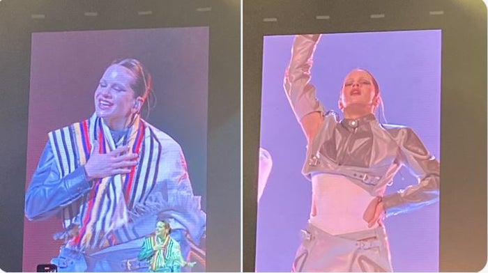 Además, en medio del concierto, sacó un poncho con la bandera colombiana, que se colocó en la cabeza, mientras leía algunos carteles, uno que le dio sorpresa a la artista decía, "Rosy seré despedido si vuelvo sin foto contigo", lo que hizo que Rosalía se tomará una selfie con él.