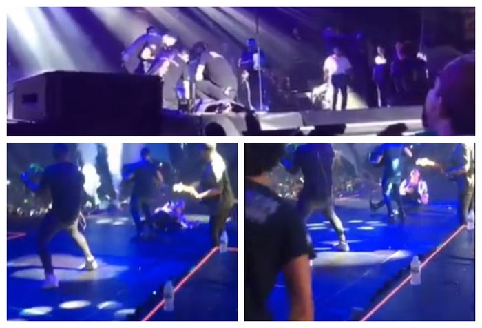 El personal de logística tuvo que ingresar al escenario para ayudarlo a levantar en medio de los gritos de sus fanáticos.