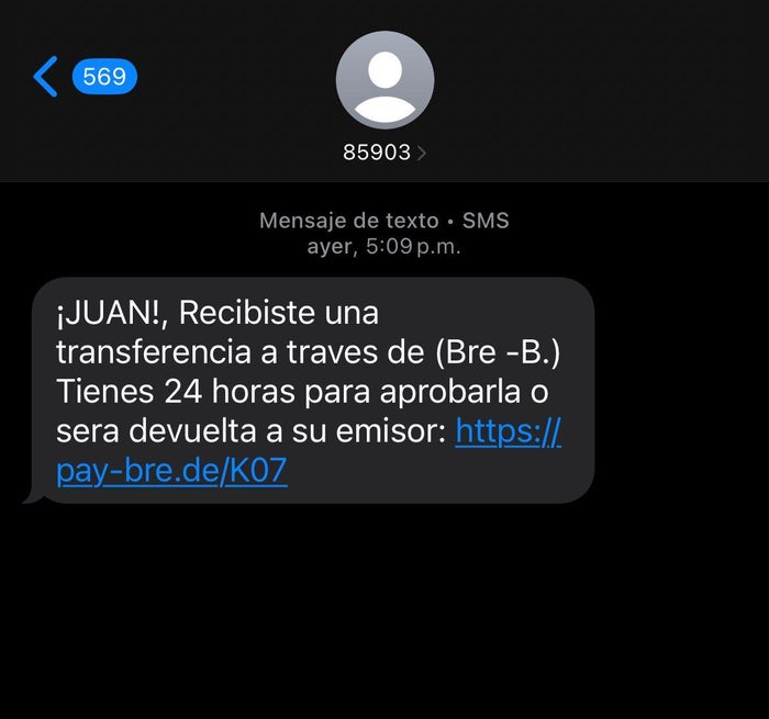 Uno de los textos que se ha vuelto viral, señala lo siguiente: “BRE B: Usted tiene una transferencia pendiente por recibir. Ingrese al siguiente enlace para aprobar el dinero antes de 24 horas, de lo contrario será devuelto”.