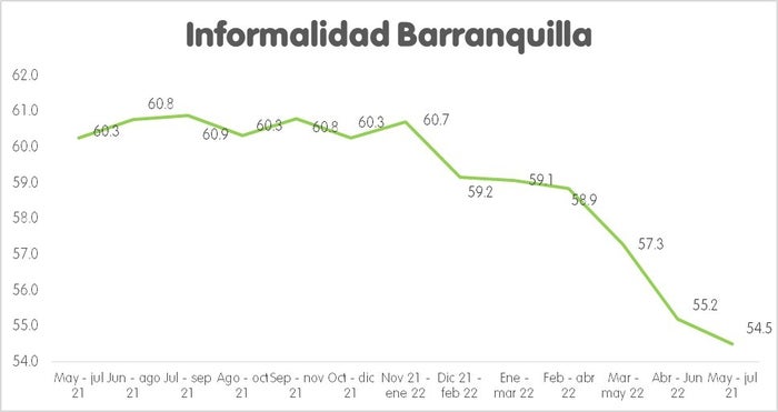 Según el Dane, la tasa de informalidad para julio de 2021 se ubicó en 60,3%, mientras que para este año fue de 54,5%. “Nos encontramos por debajo del promedio nacional, que es de 58%, y Barranquilla registra la tasa más baja de la región Caribe. Se continúan ratificando los indicadores: disminución del desempleo, aumento de los ocupados y reducción de la informalidad”, concluye Alvarado.
