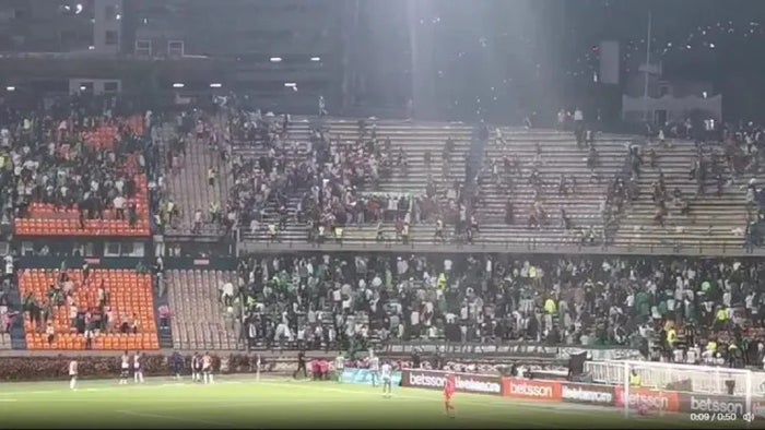 La tensión aumentó cuando Atlético Nacional anotó su segundo gol, llevando la situación a un nivel superior. Los hinchas de ambos equipos comenzaron a enfrentarse, intercambiando insultos y agresiones. Tras el gol de Marino Hinestroza, la gente empezó a evacuar, obligando a los jugadores a retirarse a los vestuarios.