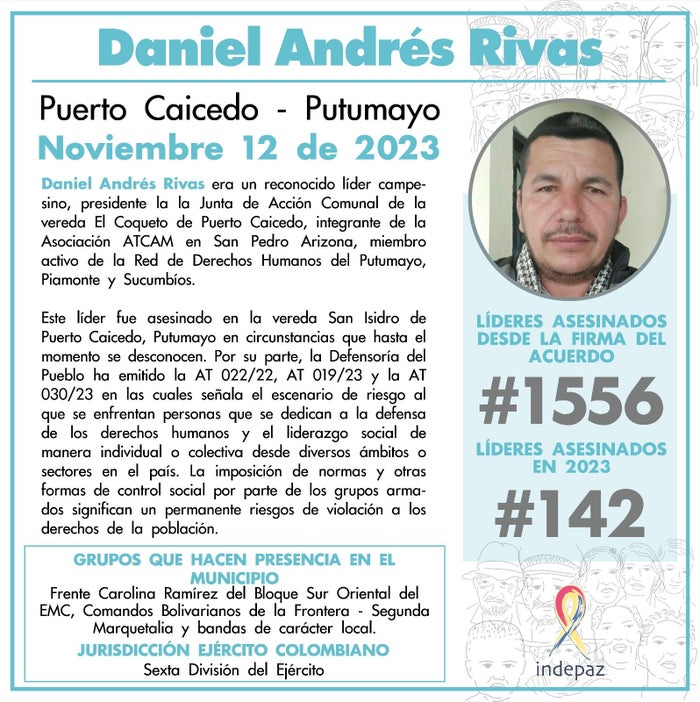 El día en el que se conmemoró día nacional de las Juntas de Acción Comunal fue asesinado Daniel Andrés Rivas Prieto, presidente de la JAC de la vereda el Coqueto del municipio de Puerto Caicedo, hacía seis años integraba la junta y era parte de diferentes organizaciones en el departamento del Putumayo.