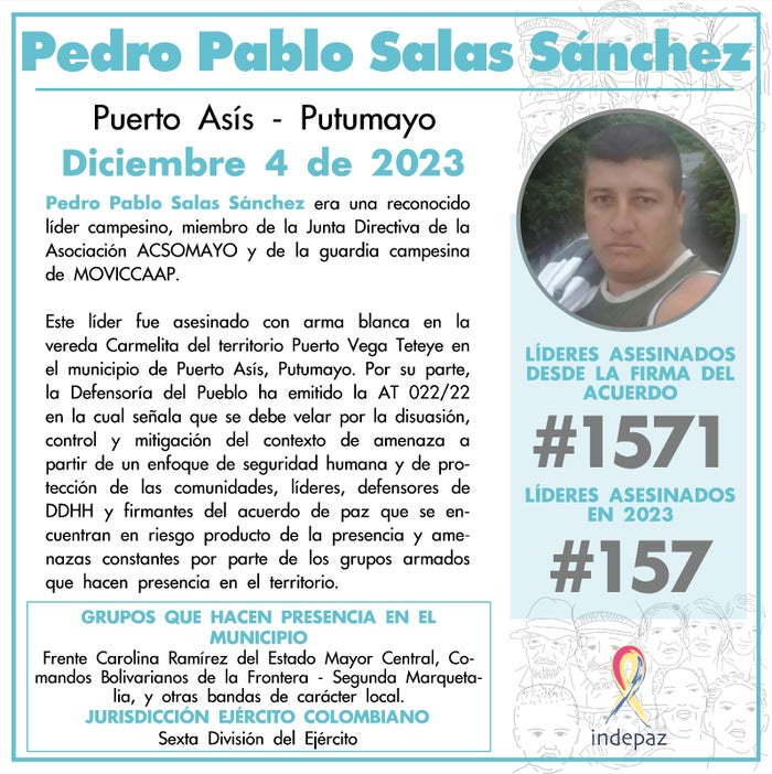 Salas Sánchez era miembro de la Junta Directiva de la Asociación (ACSOMAYO) y de la guardia campesina de MOVICCAAP, en donde se venía desempeñando en favor de las comunidades y el territorio.