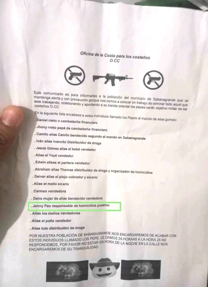 Como si fuera poco, la mujer había regresado a este municipio desde hace dos meses regresó y apareció en un panfleto amenazante de Los Costeños como "Jenny Pao" y que estarían en colaboración con Los Pepes en el municipio de Sabanagrande.