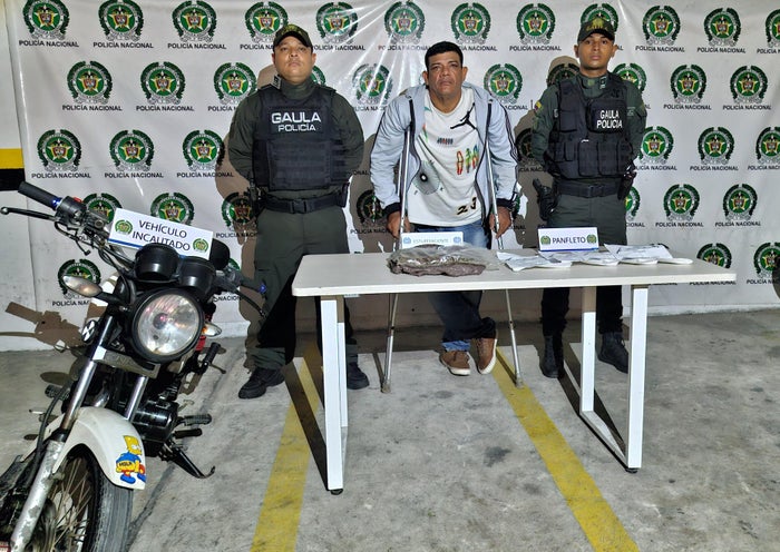 El detenido, la motocicleta, el estupefaciente y los demás elementos incautados fueron dejas a disposición de la autoridad competente por el delito de extorsión, tráfico, fabricación o porte de estupefacientes y falsedad marcaria.