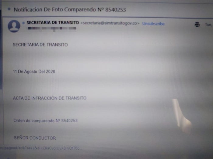 Los correos que son enviados desde una presunta cuenta oficial: secretaria@simtransitogov.co y que aparece con el asunto: notificación de foto comparendo y un número de radicado, son información falsa confirmó la administración distrital en Barranquilla, a través de la secretaría de transito .