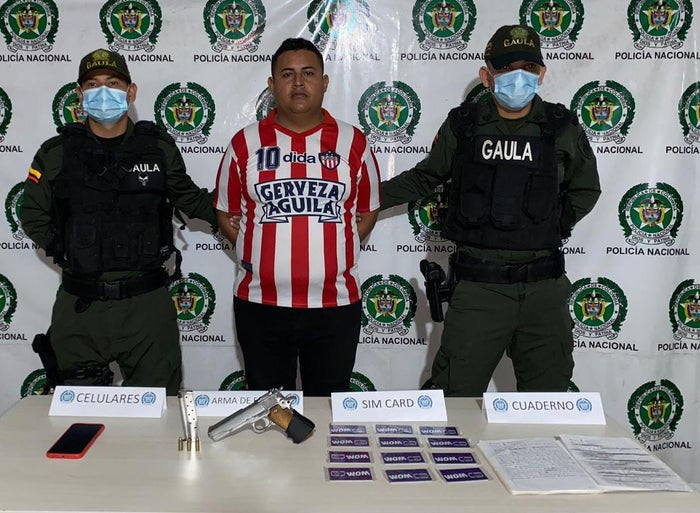 Los operativos se llevaron acabo en el barrio Villa Adela del municipio de Soledad, donde se logró la captura de este particular a quien se le incautó: un arma de fuego tipo pistola calibre 9 milímetros con tres cartuchos para la misma, una agenda donde relaciona cobros extorsivos a comerciantes, 15 tarjetas sim card y unteléfono celular.