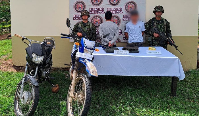 En poder de estas dos personas fueron hallados tres artefactos explosivos improvisados y uniformes de uso privativo de la Fuerza Pública, procediéndose a la captura en flagrancia del adulto y a la aprehensión del menor de 17 años de edad, quienes fueron puestos a disposición de la autoridad competente.