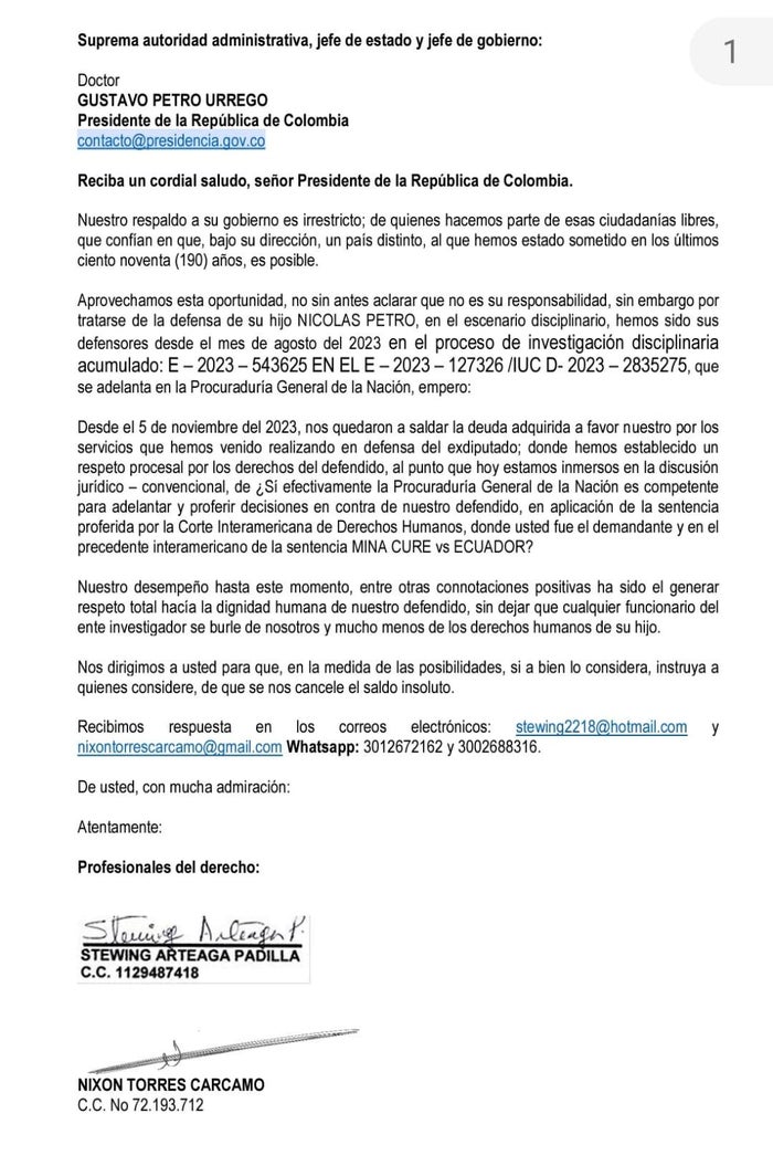 Finalmente, indican que su desempeño hasta este momento, entre otras connotaciones positivas ha sido el generar respeto total hacía la dignidad humana de Nicolás Petro Burgos. "Nos dirigimos a usted para que, en la medida de las posibilidades, si a bien lo considera, instruya a quienes considere, de que se nos cancele el saldo insoluto", concluyen en el documento.