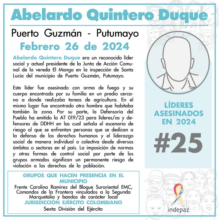 En el municipio de Puerto Guzmán fue asesinado Abelardo Quintero Duque, líder social y actual presidente de la Junta de Acción Comunal de la vereda El Mango en la inspección de Santa Lucía.