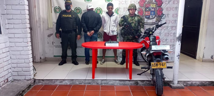 En el mismo sector, dos hombres que se desplazaban en motocicleta al notar la presencia de la Fuerza Pública, abandonaron un bolso con 2.5 kilos del alucinógeno y una pistola.