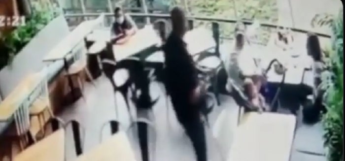 Tras robarla emprende su huida ante la mirada atónita de los meseros. La víctima se levanta de su mesa para alcanzarlo pero es amenazado con la pistola por el ladrón.