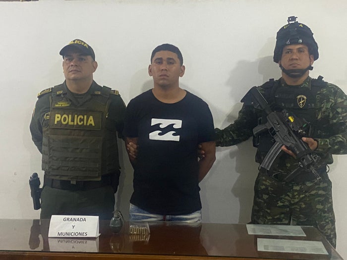En el momento de la captura, se halló al Interior de un bolso una granada de fragmentación IM26 y varios cartuchos calibre 9 milímetros, sin permiso para porte o tenencia.