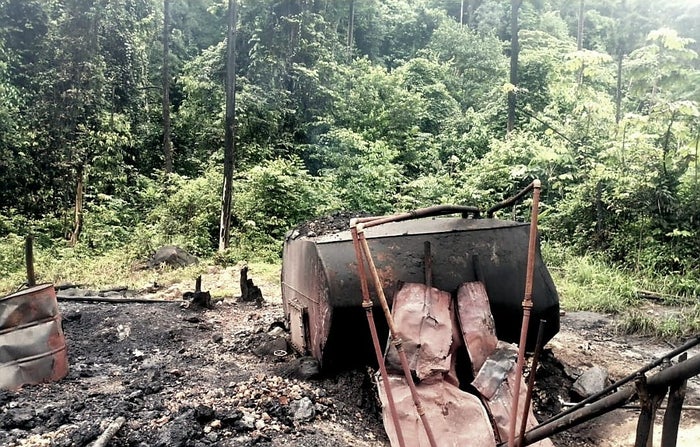 Tropas del Ejército a través de diversos operativos realizados en zona rural de Tibú, ubicaron y neutralizaron una refinería ilegal con aproximadamente 750 litros de hidrocarburo refinado, conocido como pategrillo.