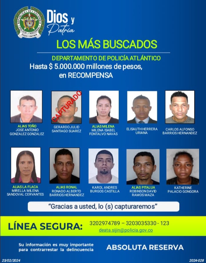 En las últimas horas el Departamento de Policía del Atlántico presentó el cartel con las personas que serían consideradas de alta peligrosidad, cuyo accionar delincuencial ha permitido, por parte de la autoridad competente, librar ordenes de capturas por delitos que afectan la seguridad ciudadana como: tráfico, fabricación o porte de estupefacientes y concierto para delinquir; hurto calificado agravado; homicidio agravado, homicidio en grado de tentativa; acceso carnal violento, homicidio y acceso carnal violento en circunstancia de agravación punitiva, en concurso homogéneo y sucesivo y en circunstancias de mayor punibilidad.