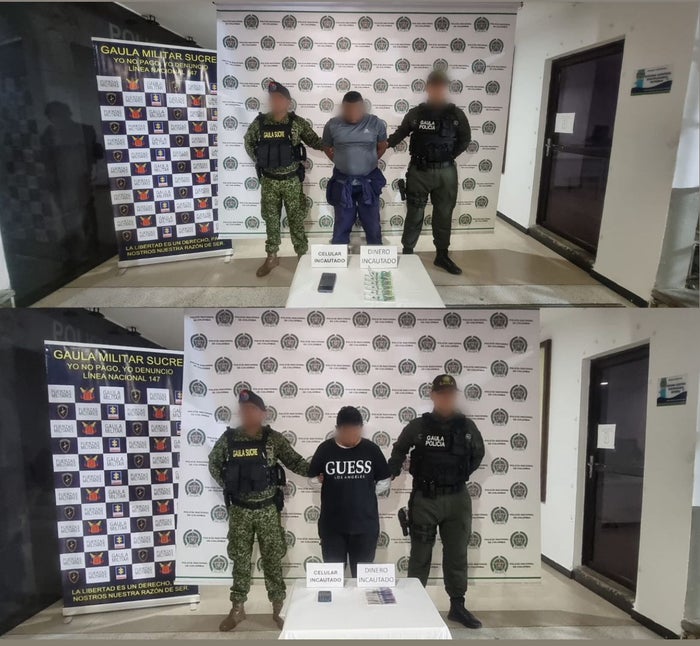 La primera captura se realizó en la calle primera con carrera 2 del corregimiento de la Gallera, zona rural de Sincelejo, cuando esta persona capturada llega al punto pactado con la víctima, quien es un conocido arquitecto de la zona, para recibir la suma de $500.000, que habían sido exigidos vìa telefónica y por mensajes por WhatsApp. Según la investigación, exigía esta cantidad de dinero a cambio de no atentar en contra de su vida, sus bienes y permitirle continuar con su actividad económica.