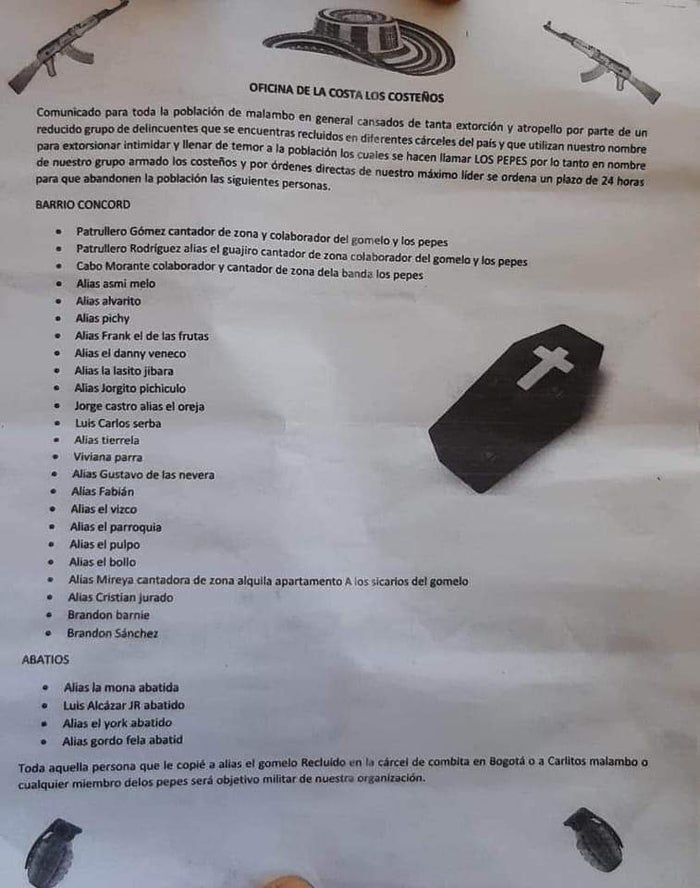 El documento señala: “Cansados de tanta extorsión y atropello por parte de un reducido grupo de delincuentes que se encuentran recluidas en diferentes cárceles del país y que utilizan nuestro nombre para extorsionar, intimidar y llenar de temor a la población, los cuales se hacen llamar ‘Los Pepes’; por lo tanto, en nombre de nuestro grupo armado ‘Los Costeños’ y por órdenes directas de nuestro máximo líder, se ordena una plazo de 24 horas para que abandonen la población”.