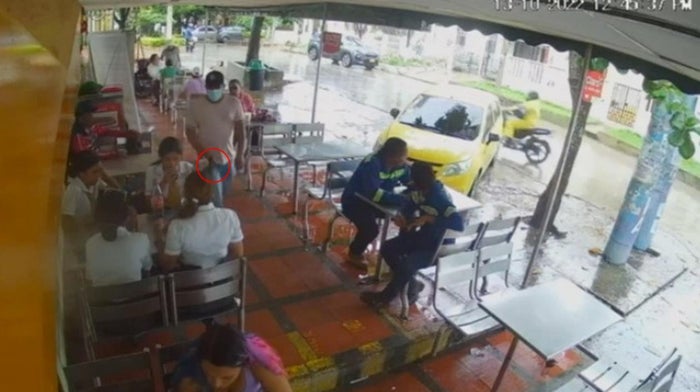 Videos de cámaras de seguridad muestra a dos ladrones que llegan a las mesas donde se encontraban varios comensales y los empezaron a despojar de sus pertenencias como celulares y otros elementos de valor.