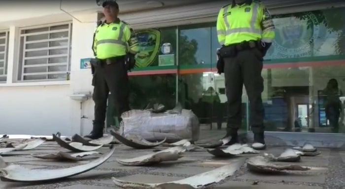 "Se logra la incautación de una mercancía que venía en un vehículo de transporte de encomiendas, pero al revisarlo se observa que hay 450 aletas de tiburón, con un costo aproximado de 35 a 40 millones de pesos, pero más allá de eso, es el costo ambiental que esto ha causado. No sabemos qué tipo de tiburón era", indicó el coronel Uribe, comandante de la seccional de Tránsito y Transportes.