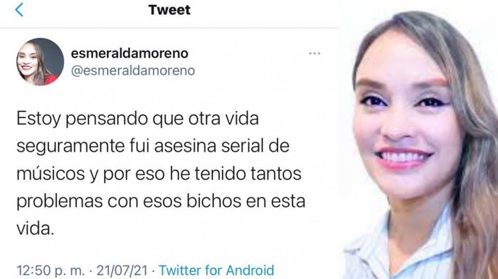 Un polémico trino tiene en el ojo del huracán a Esmeralda Moreno, secretaria de Cultura del municipio de Galapa, Atlántico, pues afirmó que en otra vida fue "asesina de músicos".