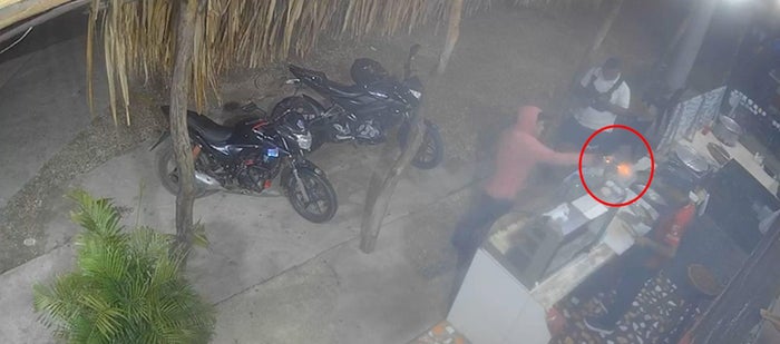 Las cámaras de seguridad del establecimiento captaron el momento con exactitud. El atacante, vestido con un buzo rojo y jean azul, se acercó al mostrador y simuló ser un cliente más, incluso haciendo una pregunta al trabajador que en ese momento atendía un pedido.