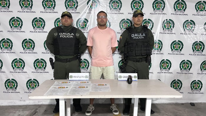 El sujeto, identificado como alias “Niño Alex”, de 32 años, fue sorprendido portando una granada de fragmentación y cinco panfletos extorsivos, elementos utilizados para intimidar a comerciantes que se negaban a pagar las sumas exigidas por esta organización criminal.