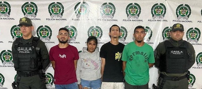 Los detenidos fueron identificados como Luis Carlos Muñoz Martínez, alias ‘Meca’; Benjamín Manuel Palencia Sarmiento, alias ‘Bartolo’; Luis Esteban Dávila Padilla, alias Amarillito; y Angie Paola Ramos Canchano, alias ‘Pecueca’.