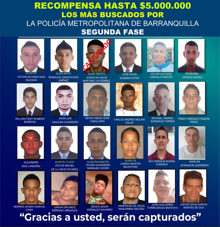 "Este cartel de los más buscados corresponde a los mandos medios de estas bandas delincuenciales acentuadas aquí en Barranquilla y su área Metropolitana. En un trabajo articulado con la Gobernación del Atlántico, la Alcaldía Distrital y la Fiscalía hemos sacado estos 24 contraventores penales, que ya uno está capturado, alias 'Tripita'. Seguimos en esta ofensiva entregando puerta a puerta a propietarios de negocios estos carteles, y lo haremos por aire y tierra para que los conozcan y nos brinden información al respecto", sostuvo.