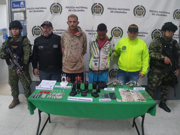 Mediante diligencia de allanamiento en el sector del barrio la esmeralda, se logró la captura de estos sujetos antes en mención, a quienes presuntamente se les halló en su poder; dos Revolver, 12 cartuchos calibre 38, 45 gramos de marihuana contenidos en 40 cigarrillos, 5 gramos de base de coca distribuidos en 5 papeletas.