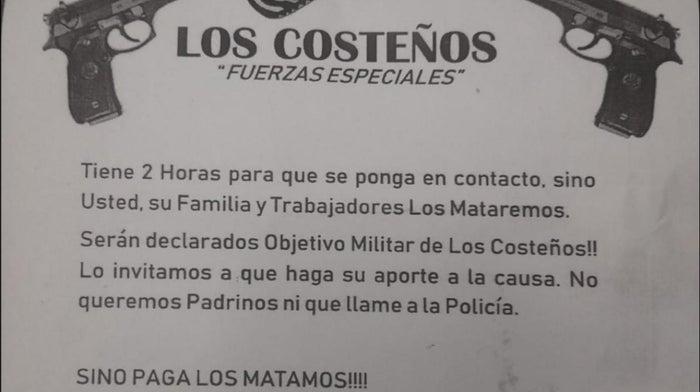 Dentro del panfleto, aparece un número de celular en donde le piden a los comerciantes que se comuniquen solo por Whatsapp "tienen dos horas para ponerse en contacto, sino usted, su familia y trabajadores lo mataremos. Serán declarados objetivos militar de 'Los Costeños'. Los invitamos a qué haga aporte a la causa. No queremos padrinos ni que llame a la Policía, sino paga los mataremos".