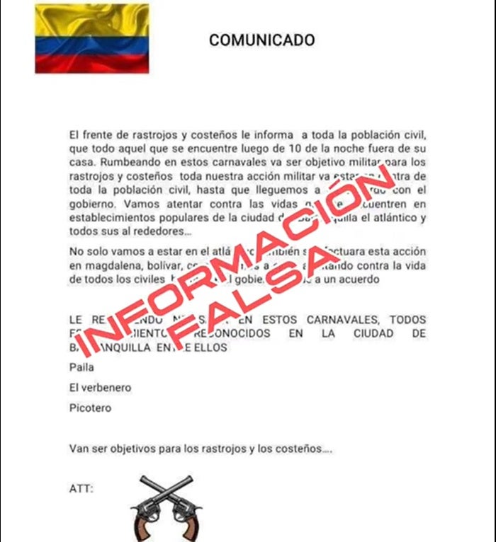 Las autoridades indicaron que amenazas, terrorismo y pánico tienen sanciones ejemplarizantes, por lo que han invitado a la comunidad a verificar la información de redes sociales y romper la cadena de la desinformación, señalando que luego de un trabajo de verificación de ciertas informaciones que están circulando en redes sociales, entre ellas, un cartel en el que, supuestamente, el grupo criminal los Costeños aseguran que todo aquel que después de las 10 de la noche esté fuera de su casa rumbeando en estos Carnavales, sería objetivo militar.