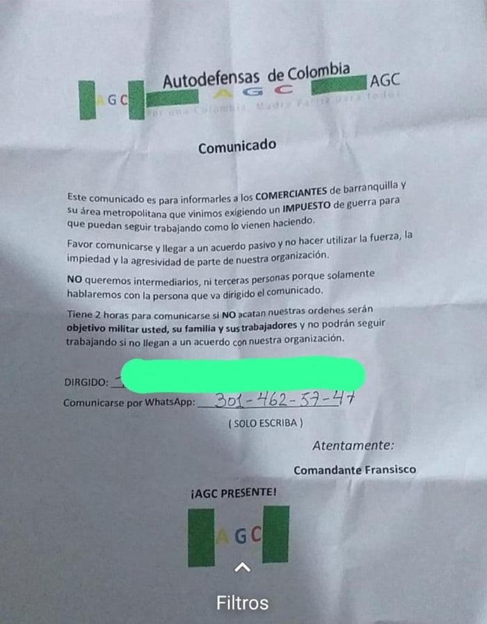 Comerciantes en Barranquilla reciben panfletos, de no pagar extorsiones son declarados objetivo militar