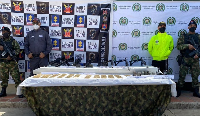 Fueron decomisadas siete armas largas, un arma corta, 1.075 municiones de guerra, 22 proveedores, dos radios de comunicación, seis chalecos multipropósito, tres equipos de campaña y cinco camuflados.