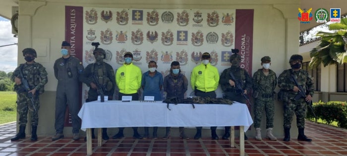 Los detenidos fueron identificados como José Domingo Benítez Polo, alias ‘El Chino’ y Manuel Gregorio Pérez Fuentes, quienes fueron capturados mediante orden judicial y en flagrancia, respectivamente, el 16 de septiembre último en la vereda Ponciano Bajo del municipio de Cáceres (Antioquia).