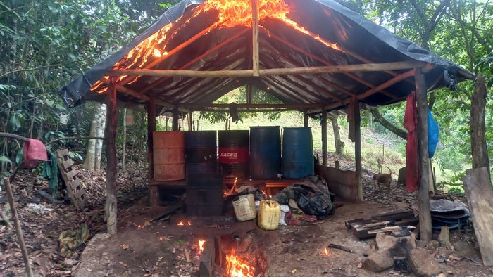 Hace dos semanas durante acciones militares en zona rural de los municipios de San José de Uré y Montelíbano, Córdoba fueron destruidas de forma controlada tres estructuras de madera que contenían 400 galones de pasta base de coca en proceso, 36 galones de gasolina, 24 canecas, 50 kilogramos de cal, 3 prensas artesanales y amoniaco, entre otros insumos líquidos y sólidos para la fabricación del alcaloide.
