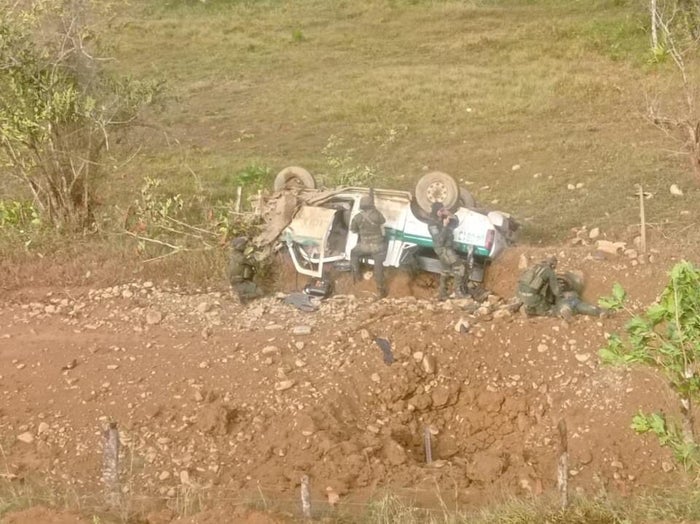 Cortesía/Cprdoberxia Camioneta de la Policía atacada con explosivos.