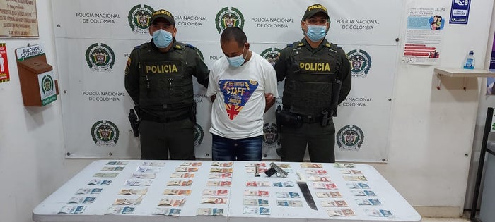 Inmediatamente los uniformados abordaron al ciudadano y le realizan un registro personal hallando en su poder más de $ 500.000 pesos colombianos, un arma de fuego tipo pistola con un proveedor para la misma y un arma corto punzante tipo cuchillo, elementos que usó para intimidar a sus víctimas y hurtarles el dinero, al sitio llegaron las personas afectadas y señalaron al hoy capturado como responsable del hecho.