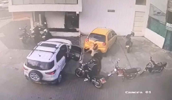 En el video, se ve como un hombre que salió de un establecimiento comercial se dispone a subirse a su vehículo, de inmediato llega un primer motorizado quien viste de negro, y sobre la marcha saca un arma de fuego e intimida a su víctima.