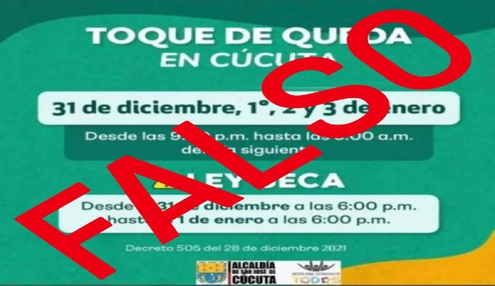 Desde la Administración se ha dicho, que pese a esta imagen tener lo logos de la Alcaldía, la misma es completamente falsa y no se tiene previsto que desde el 31 de diciembre de 2021 y hasta el 3 de enero de 2022 se tenga toque de queda, entre las 9:00 p.m. y las 5:00 a.m. del siguiente día, y ley seca en Cúcuta.