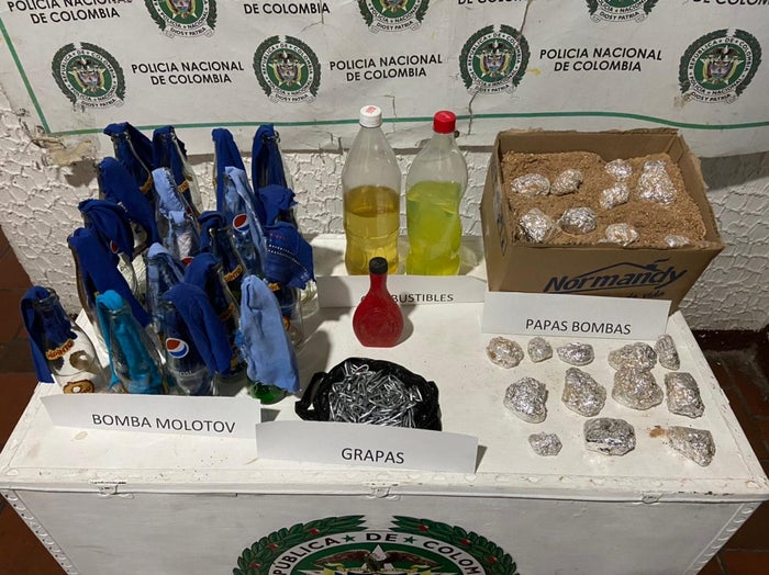 "De manos del Ejército y de la Fiscalía, la Policía realizó un operativo la noche anterior, en zona boscosa perimetral a la universidad de Pamplona, en donde hallaron una caja de cartón con 28 papas bombas, 15 bombas molotov, un tarro con pólvora negra, una bolsa con grapas, dos recipientes con gasolina y Acpm", dijo el coronel Carlos Martínez, comandante de la Policía de Norte de Santander.