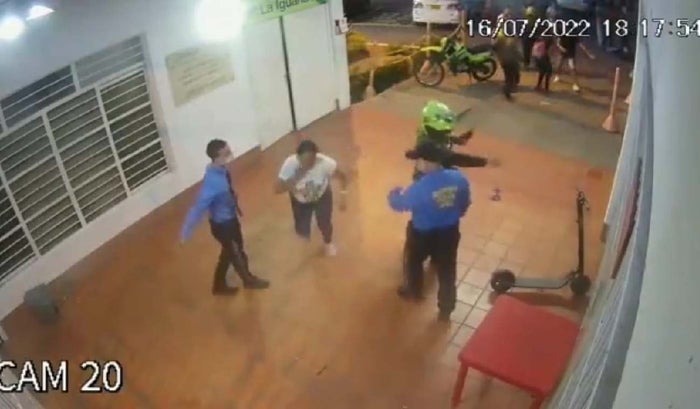Se puede ver en las imágenes un forcejo que se da entre la víctima y el guarda de seguridad Luis Rodolfo Rivillas Henao, que al parecer le impedía entrara nuevamente, ya que minutos antes se habría dado un altercado al interior del centro recreativo entre el hoy fallecido y otro hombre.