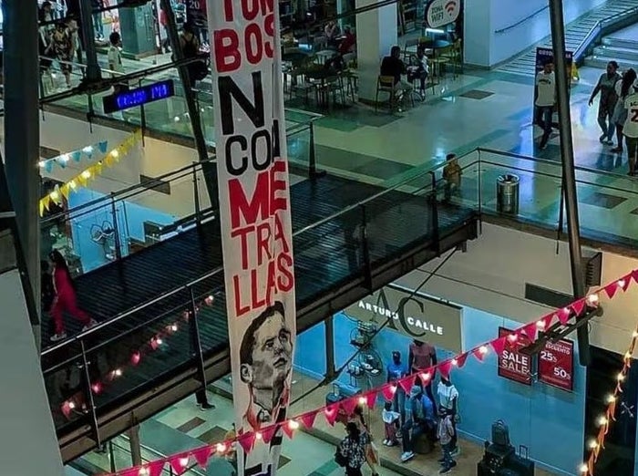 Las autoridades ya identificaron a dos jóvenes, un hombre y una mujer que instalaron la valla de 5 metros de largo en el tercer piso del centro comercial.