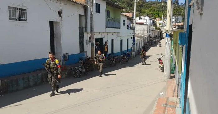A través de las redes sociales, se observan imágenes en donde al menos diez hombres armados de las disidencias de las Farc, este lunes 30 de enero, recorren las vías del casco urbano del municipio de San Calixto, en Norte de Santander.