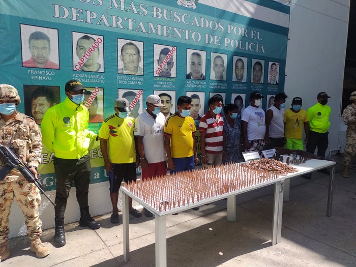 Las autoridades señalaron que para el desarrollo de estos operativos fue vital la información de los ciudadanos, lo que permitió este contundente resultado en zona rural del municipio de Manaure y Uribía, en las cuales fueron capturados alias ‘Emilio’, ‘Juanpa’, ‘Luis’, ‘Vangrieken’, ‘Alvarito’, ‘Beto’, ‘Gasparin’ y alias ‘Carmen’, a quienes les incautaron una pistola, 2.612 cartuchos para fusil AK-47 y una granada de fragmentación. Además, reportaron que se les encontró elementos que habían sido hurtados a turistas, como son un anillo y una cadena de oro.
